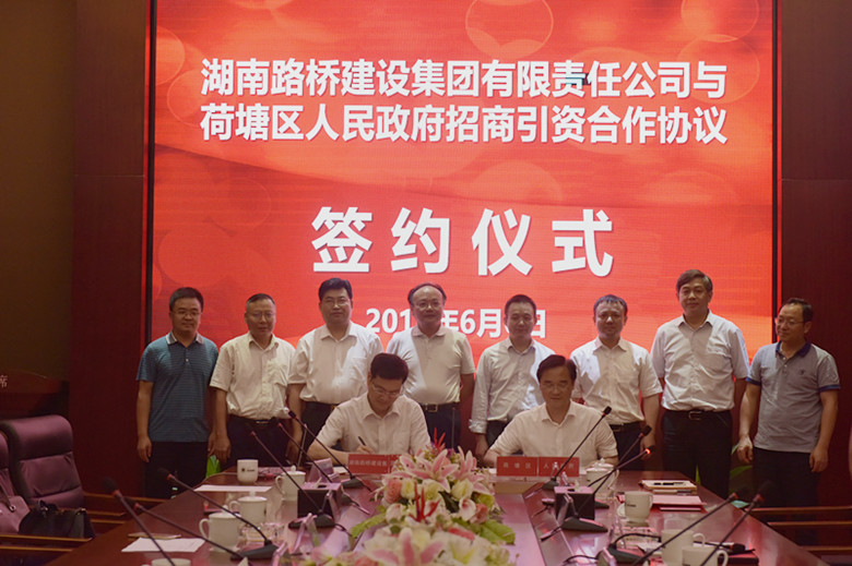 6月6日,湖南路桥建设集团有限责任公司与荷塘区人民政府招商引资合作协议签约仪式在金山新城举行。省国资委党委委员、副主任杨平,株洲市人民政府副市长何朝晖,省交通水利建设集团党委书记、董事长方联民,株洲市国资委党组党委书记、主任吴晓光,省路桥集团党委书记、董事长杨宏伟,及区领导邬凌云、王利波、何恒仁、刘国梁、陈柏文、易海平等出席签约仪式。