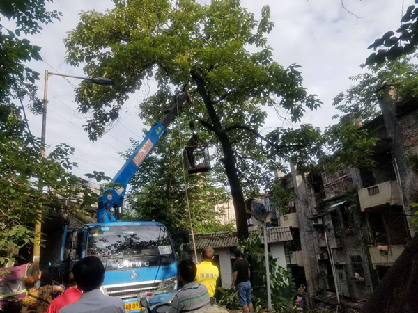 上午八点多,整个麻园社区被拉闸临时停电。株洲市电力部门和市绿化办工作人员来到隐患现场,立即着手动用专业工具花了将近四个多小时才将倒塌的大树切割完毕,然后用吊车堆放装车。经过一上午的努力,安全隐患终于得以排除,附近居民心中的大石头落下。